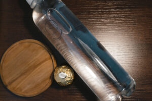 Coffee and tea station with a complimentary snack basket, bar fridge and microwave.